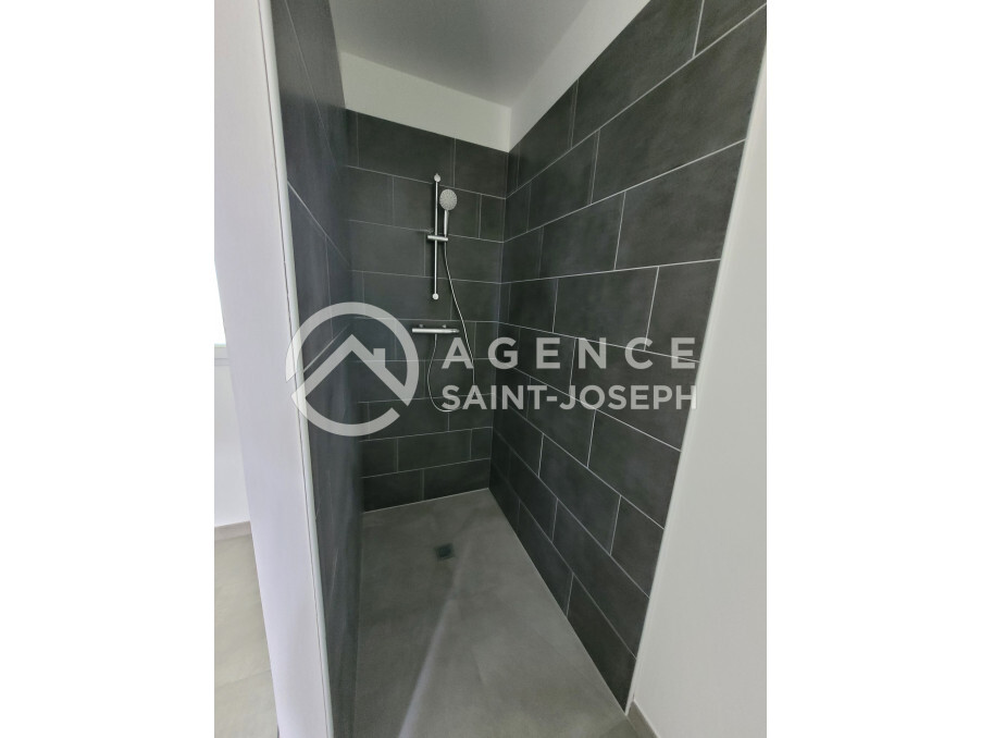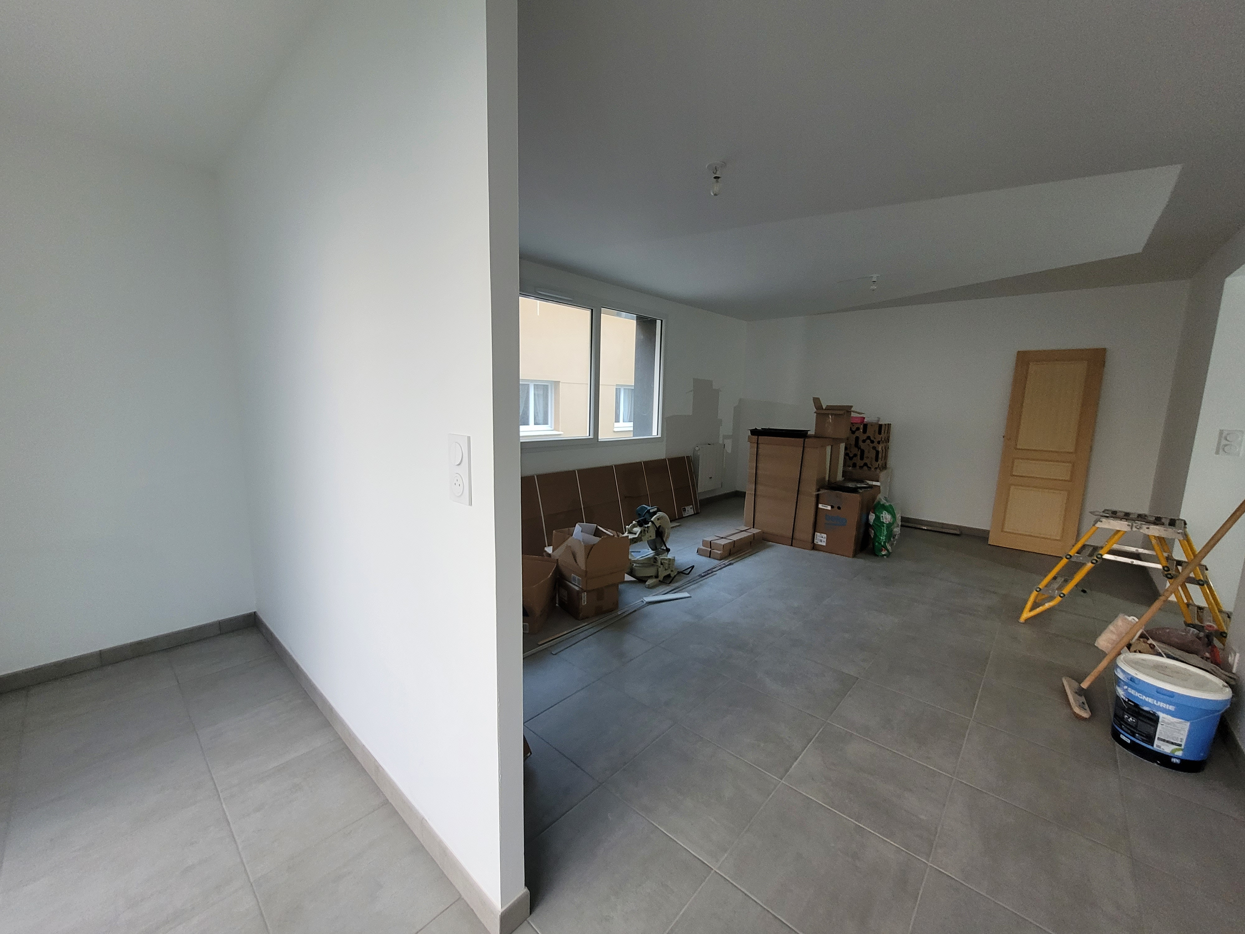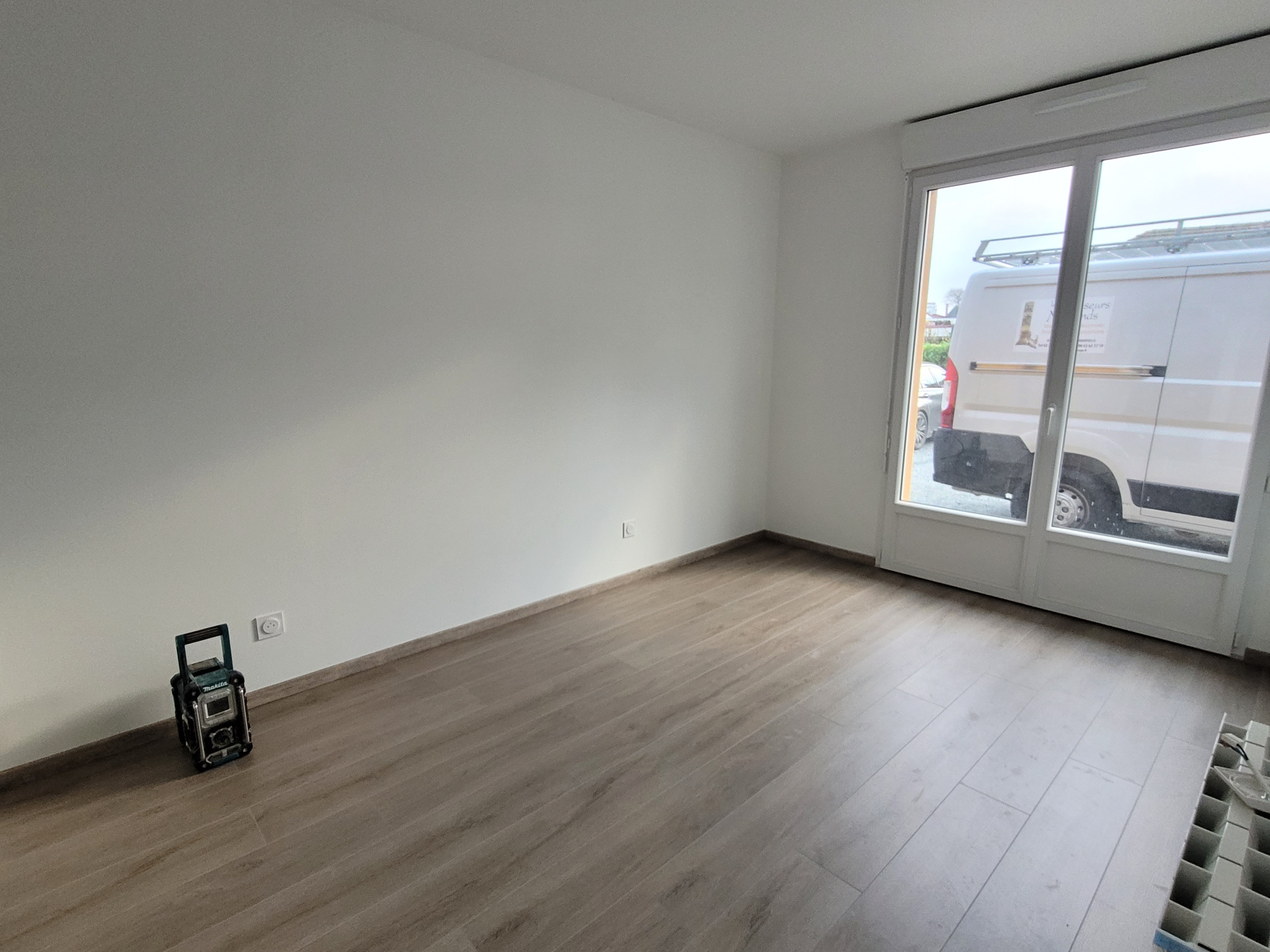 Un appartement T3 NEUF, en rez-de-chaussée, comprenant : une entrée dans le séjour, ouvert sur un coin cuisine aménagée et équipée (four, plaque, hotte), un dégagement desservant deux chambres et une salle de douche (à l’italienne, avec meuble vasque et WC) ;