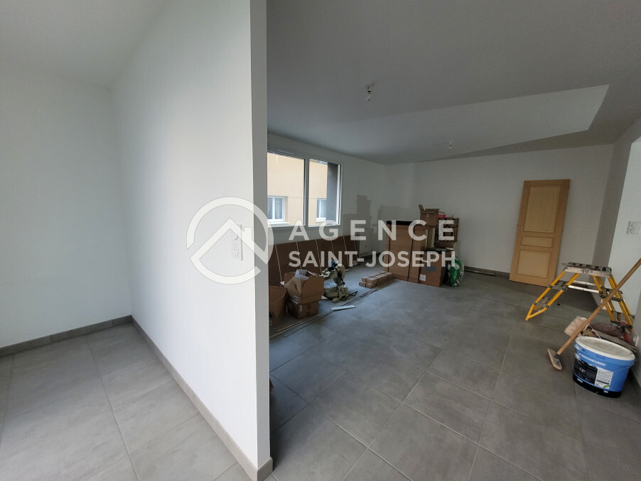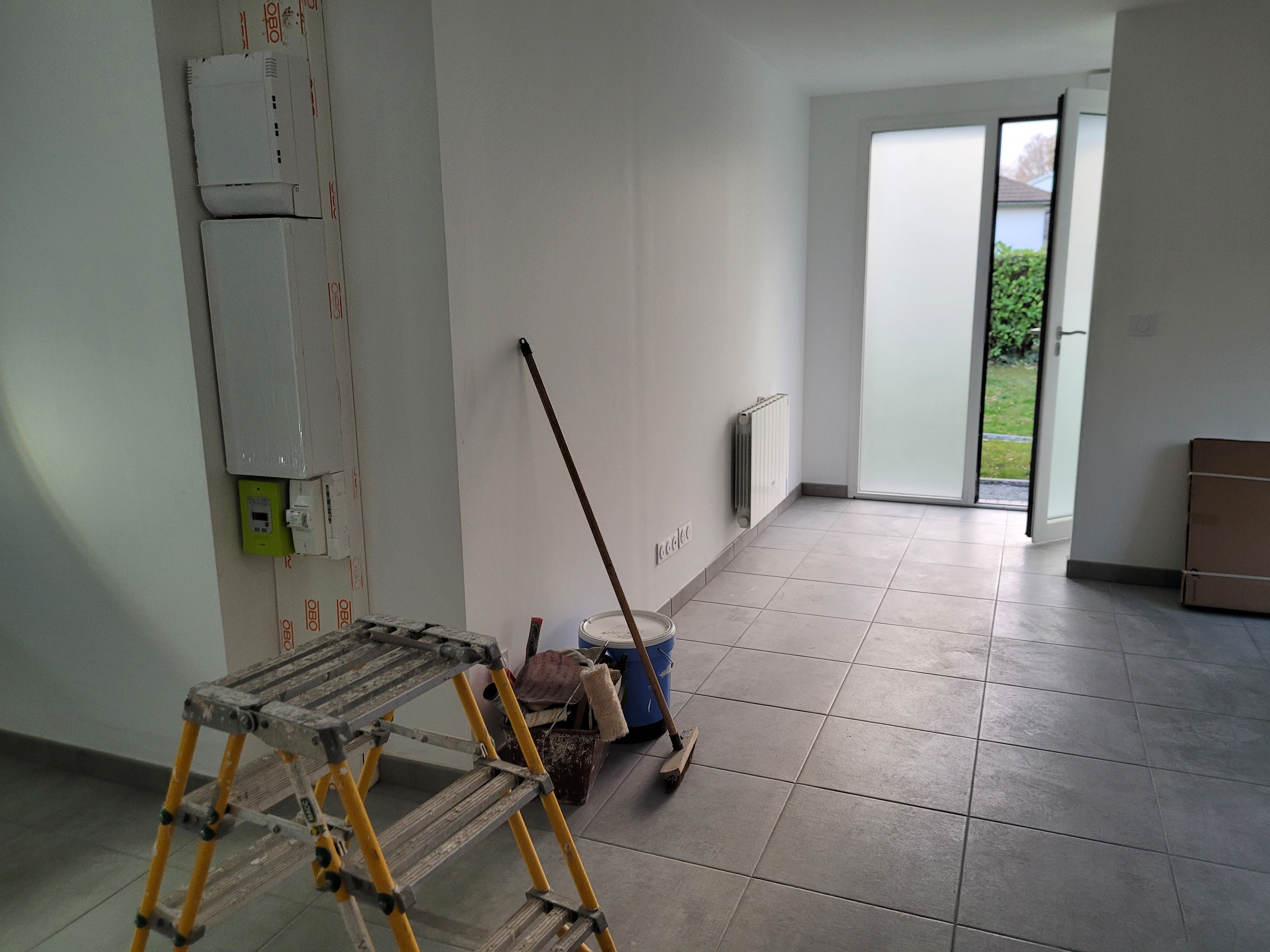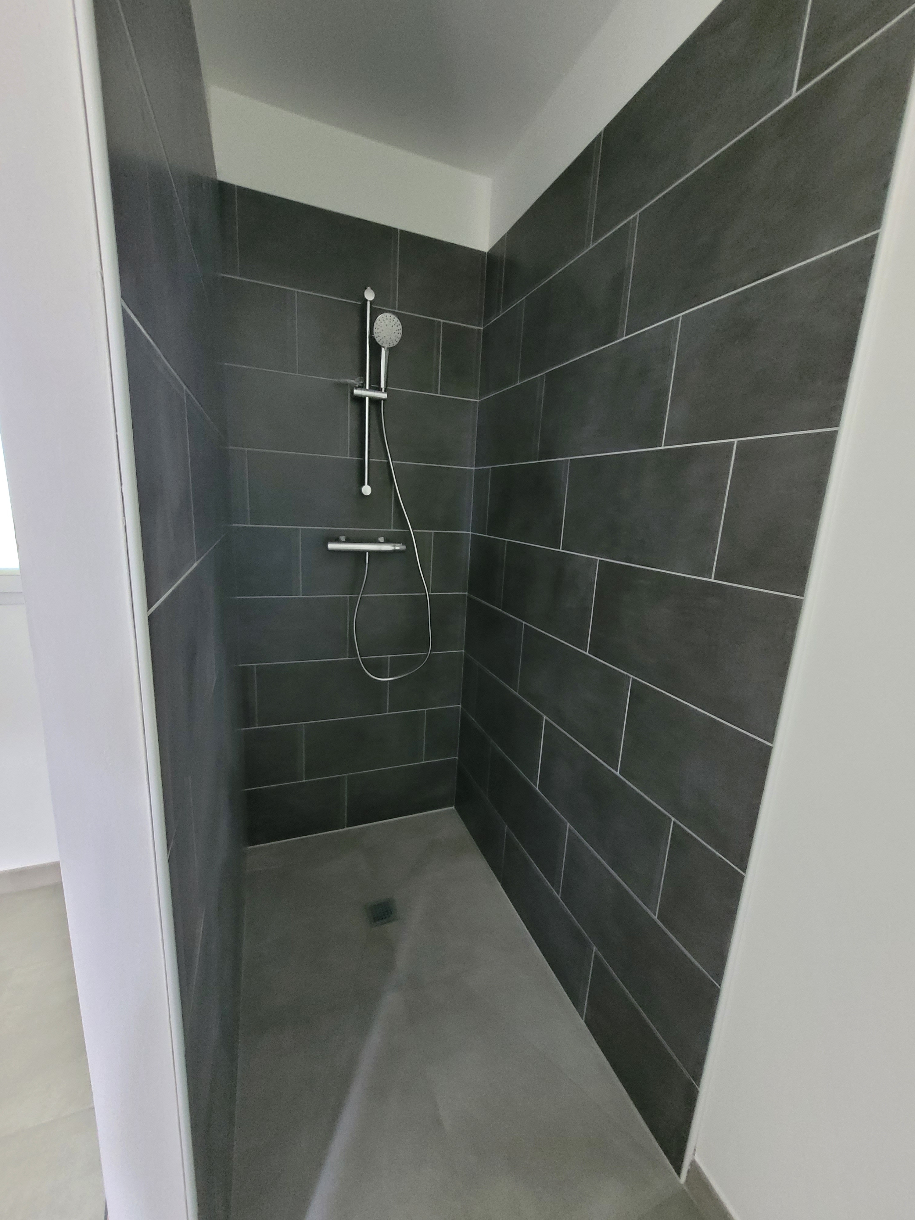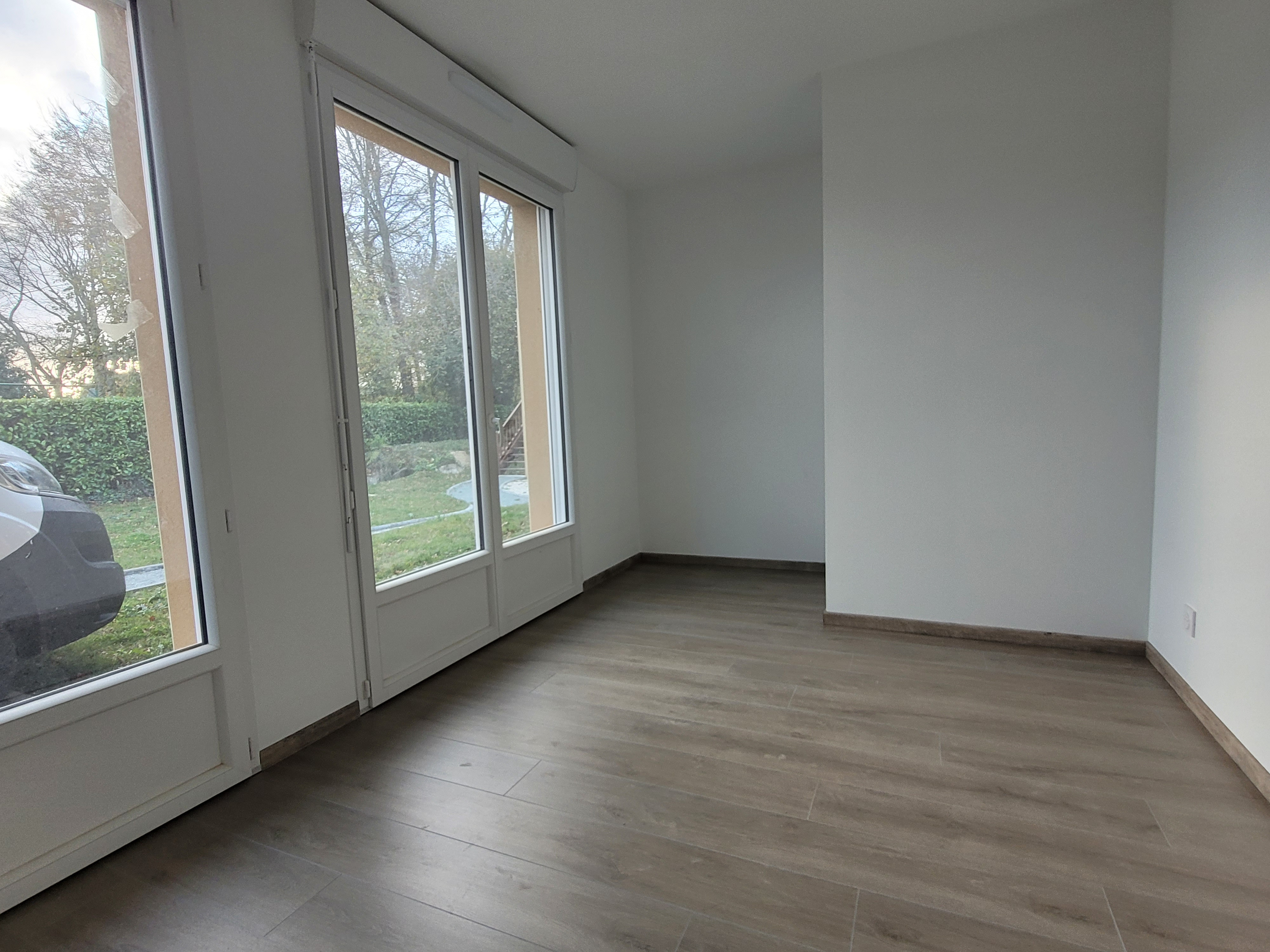 Un appartement T3 NEUF, en rez-de-chaussée, comprenant : une entrée dans le séjour, ouvert sur un coin cuisine aménagée et équipée (four, plaque, hotte), un dégagement desservant deux chambres et une salle de douche (à l’italienne, avec meuble vasque et WC) ;