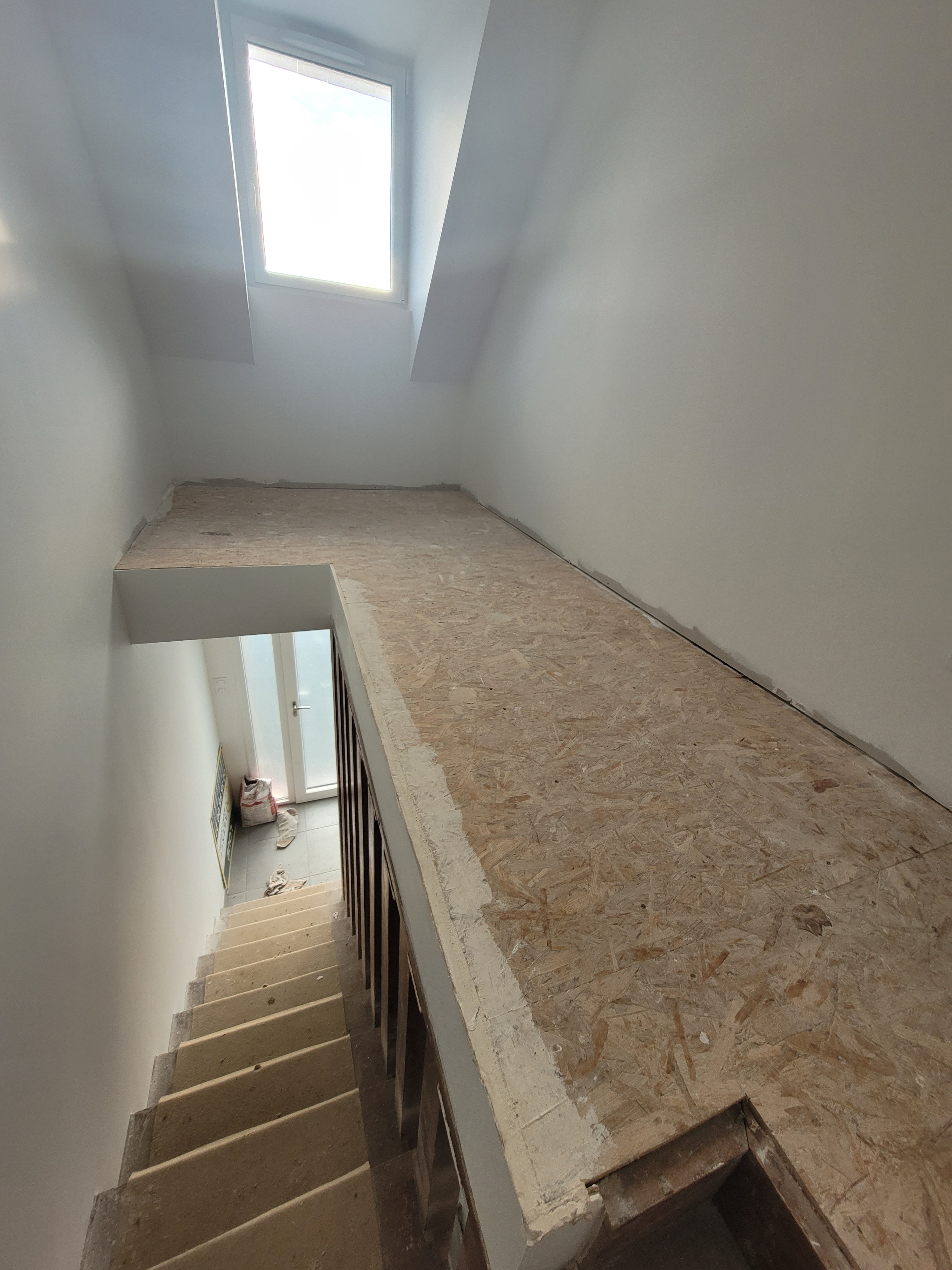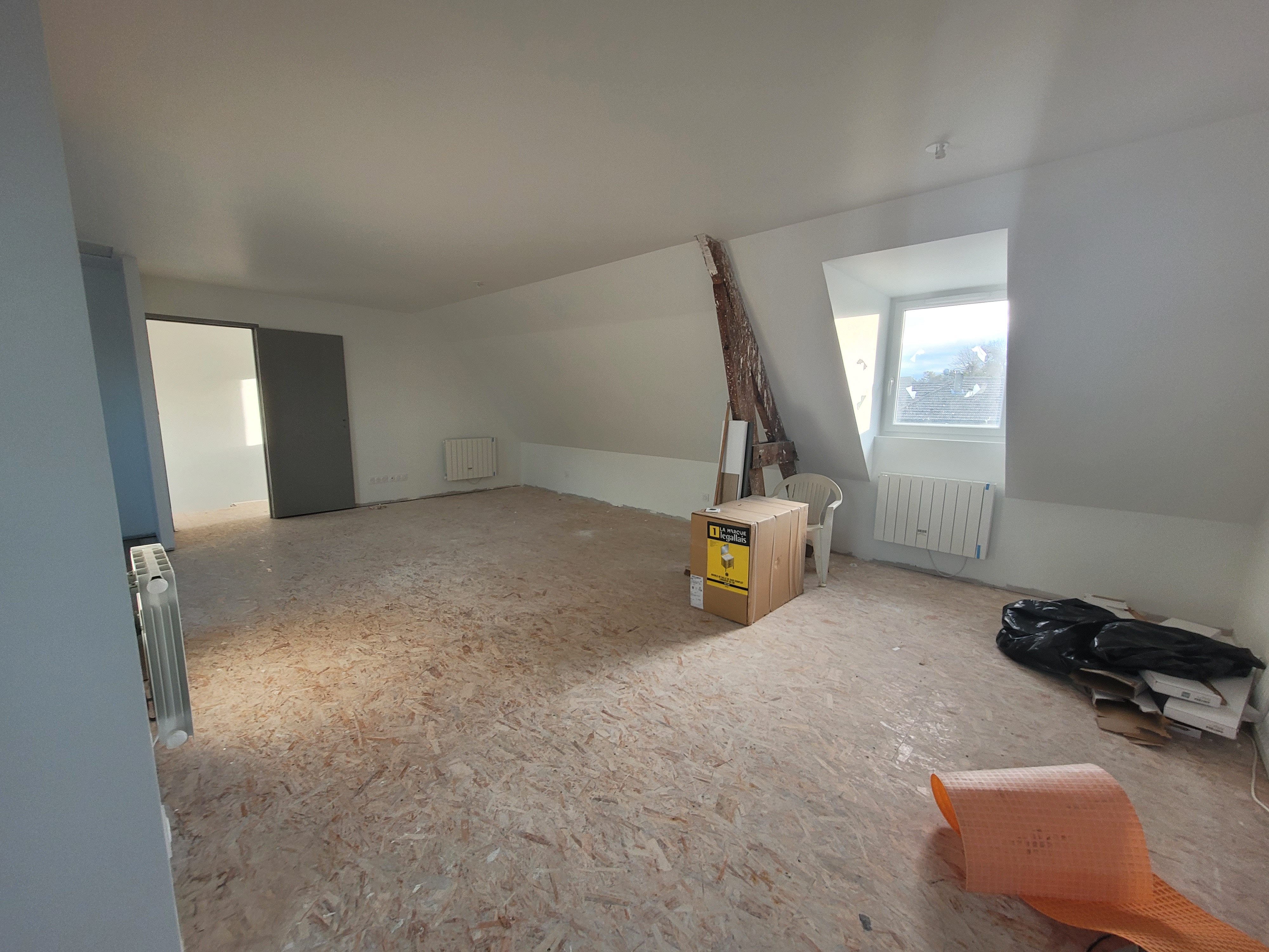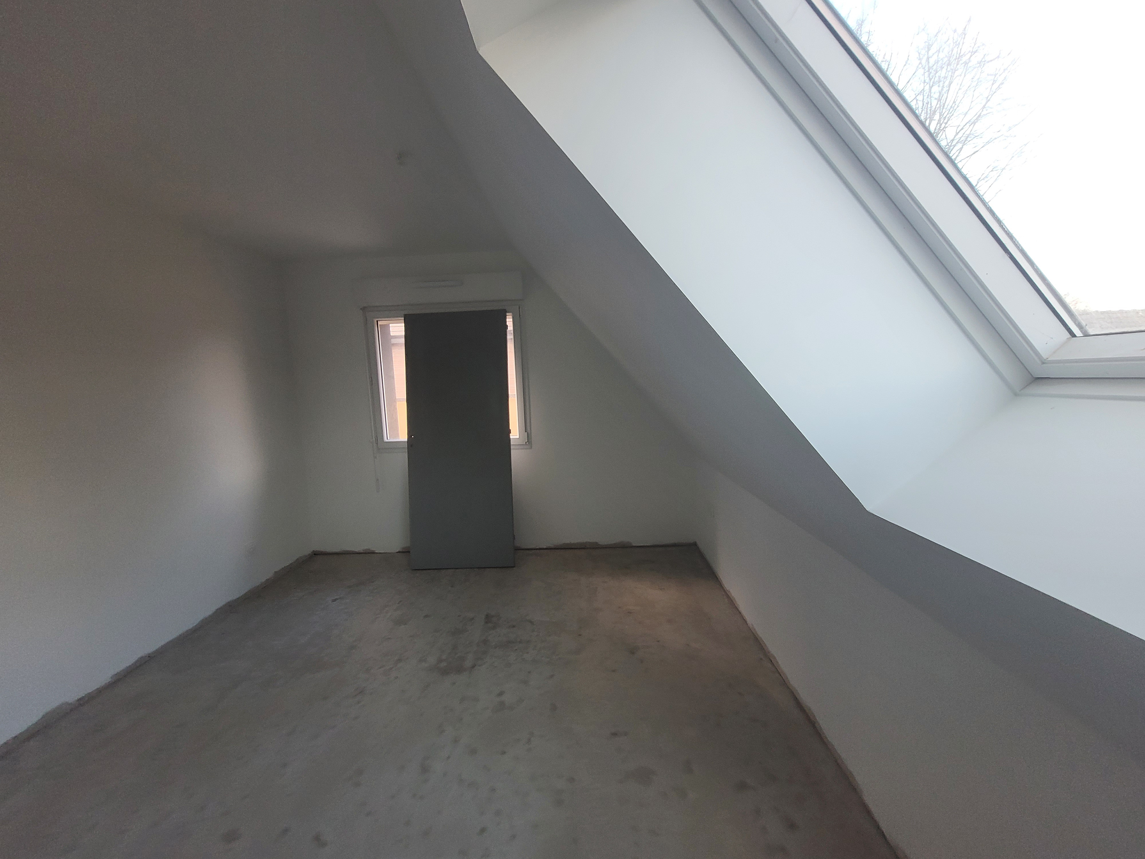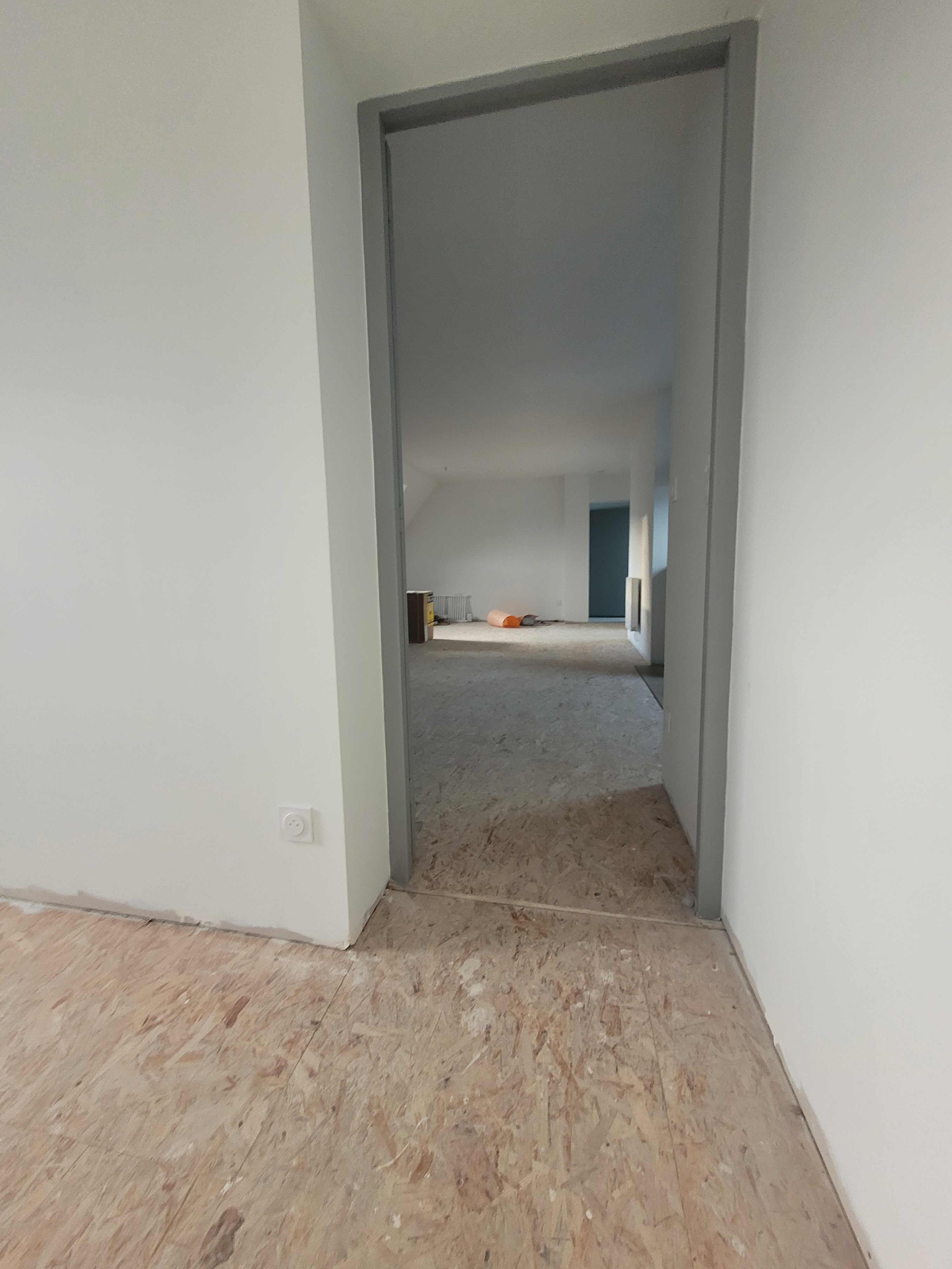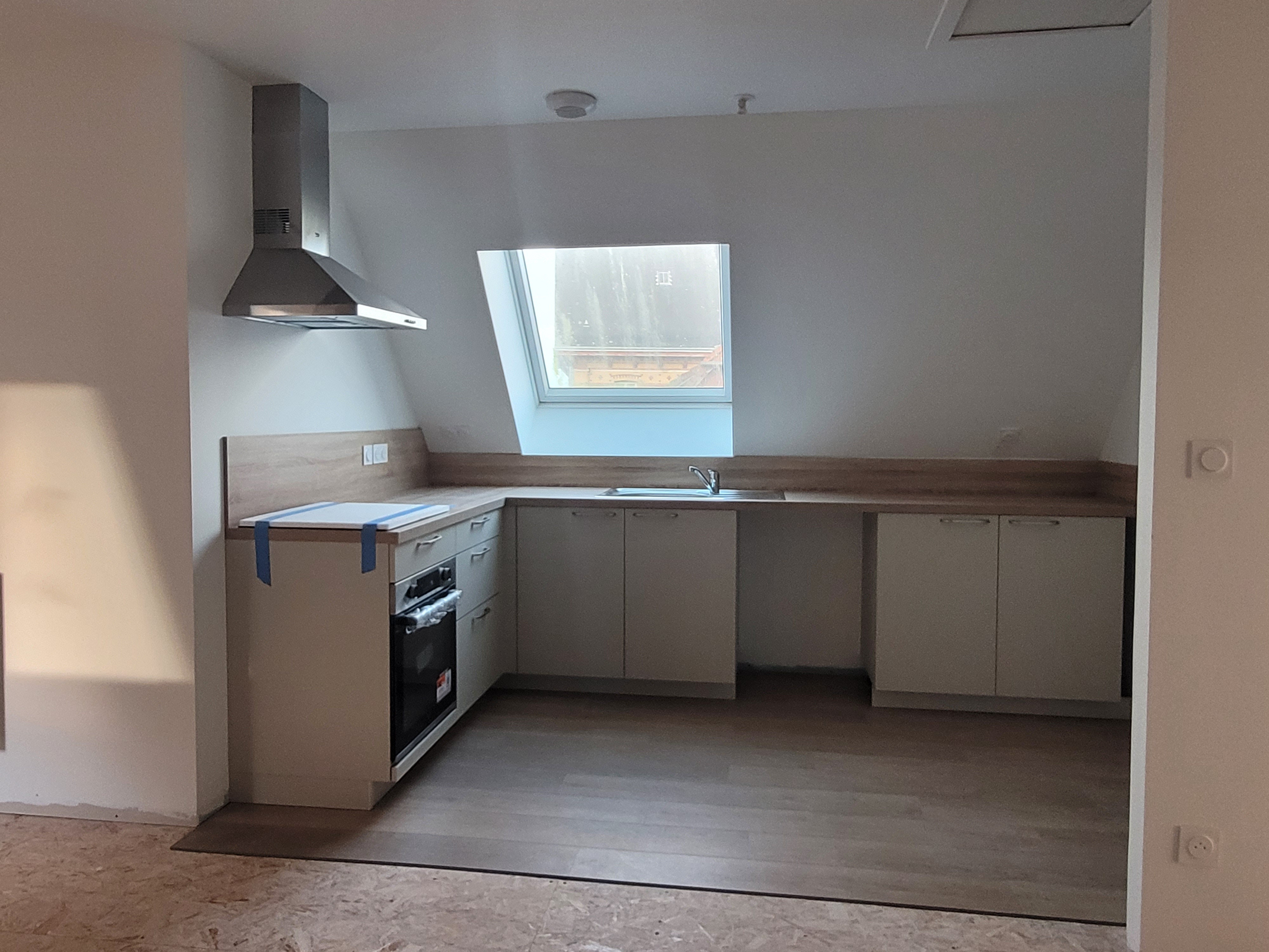 Un appartement T3 NEUF, en DUPLEX, comprenant : une entrée au rez-de-chaussée avec un escalier emmenant sur le reste de l'apartement au premier étage, avec un palier lumineux, un séjour ouvert sur un coin cuisine aménagée et équipée (four, plaque, hotte), une salle de douches avec WC, et deux chambres ;
