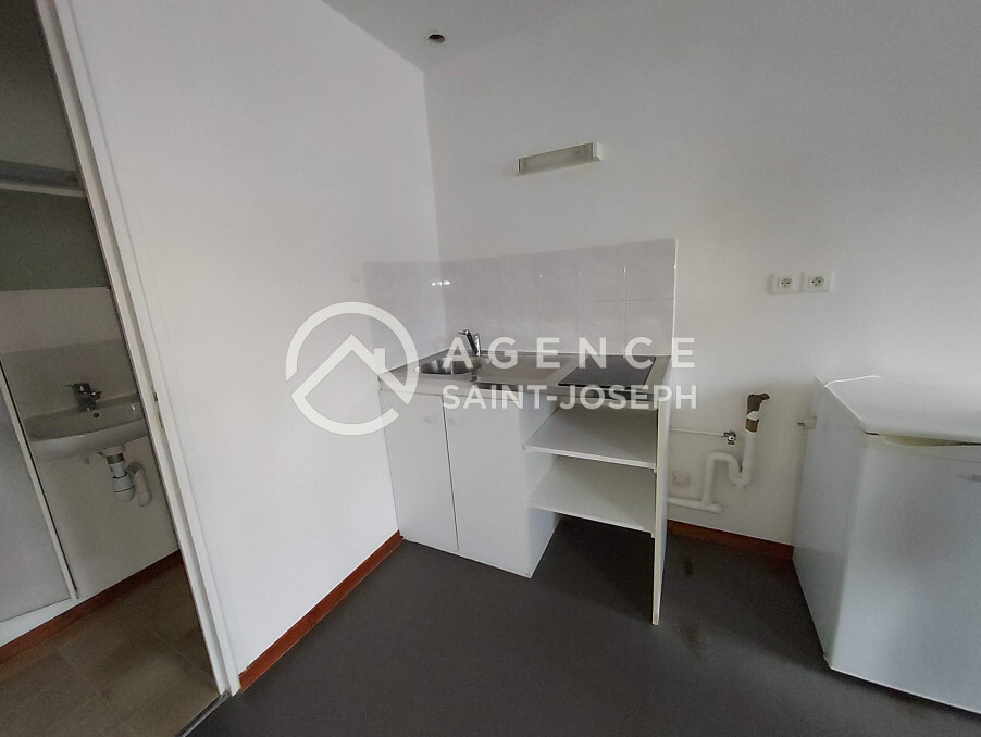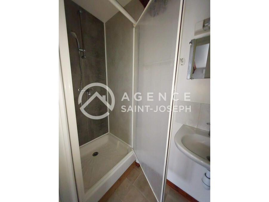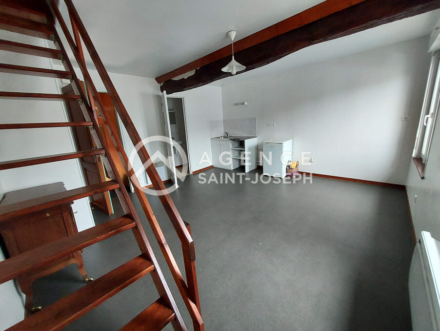 Appartement T2 en duplex au 1er étage comprenant une pièce à vivre avec coin cuisine aménagée et équipée (évier, plaques 2 feux et petit réfrigérateur), une salle de douches avec WC, une chambre sous combles.