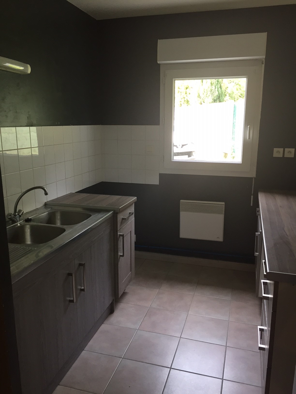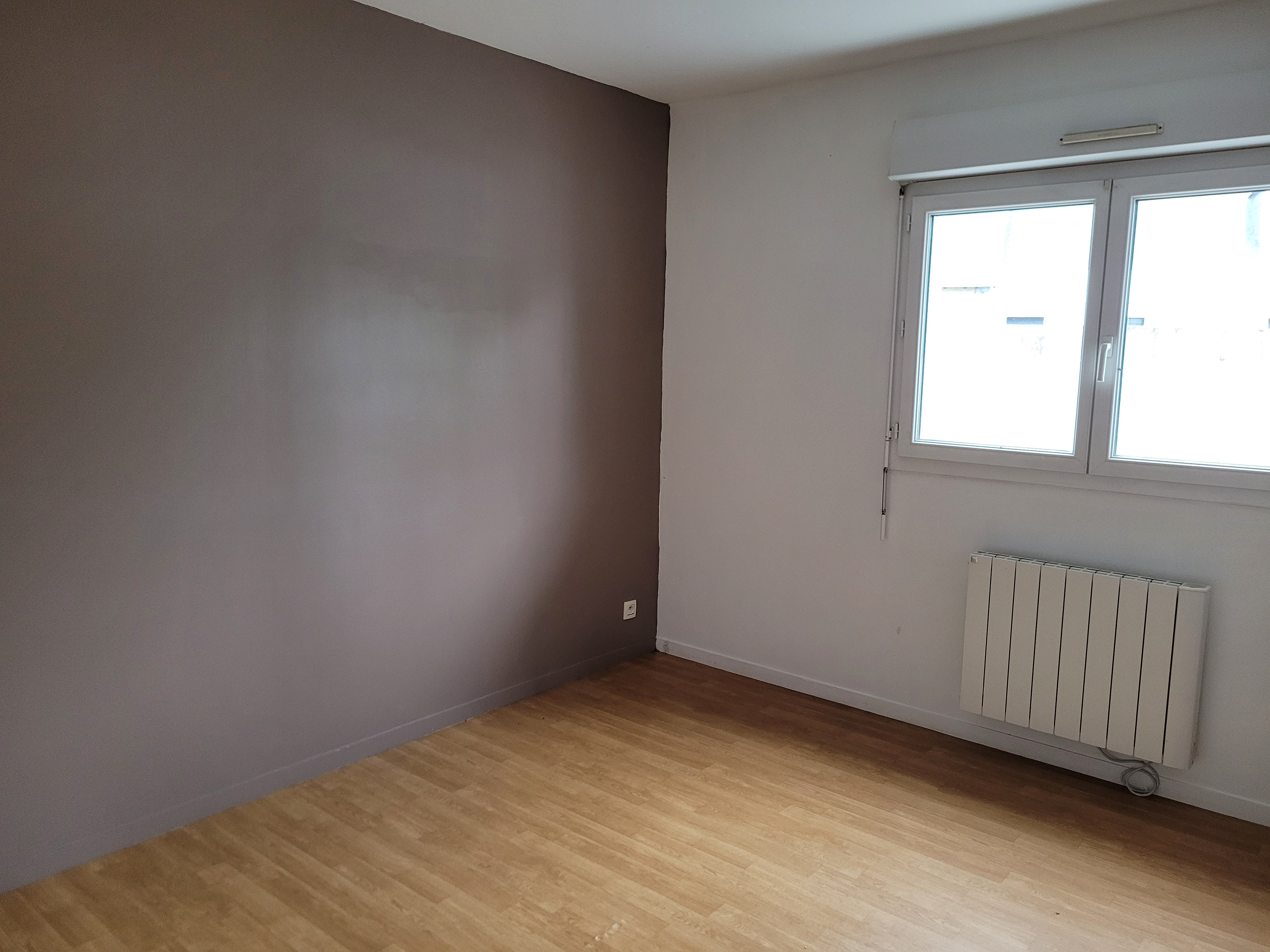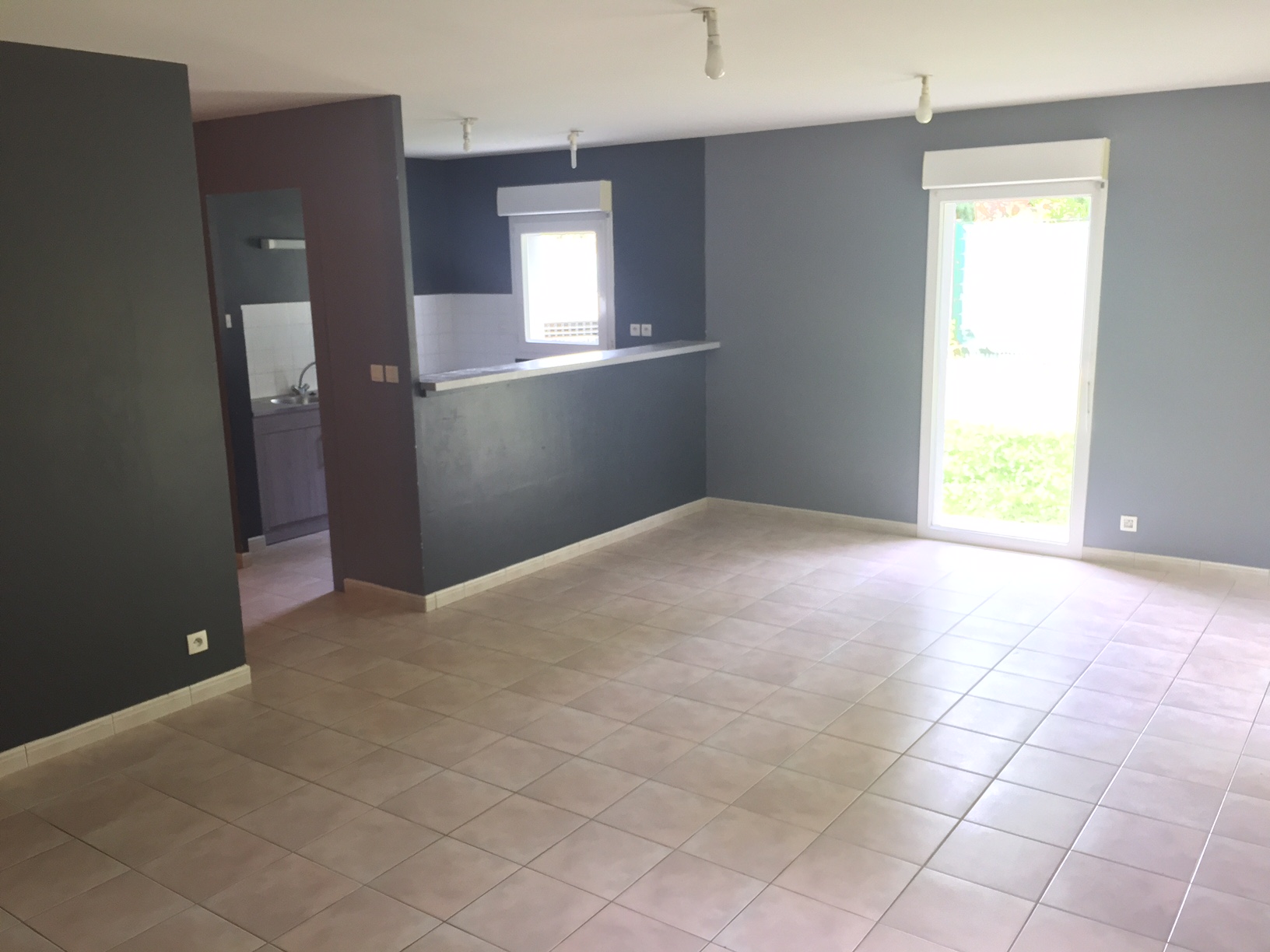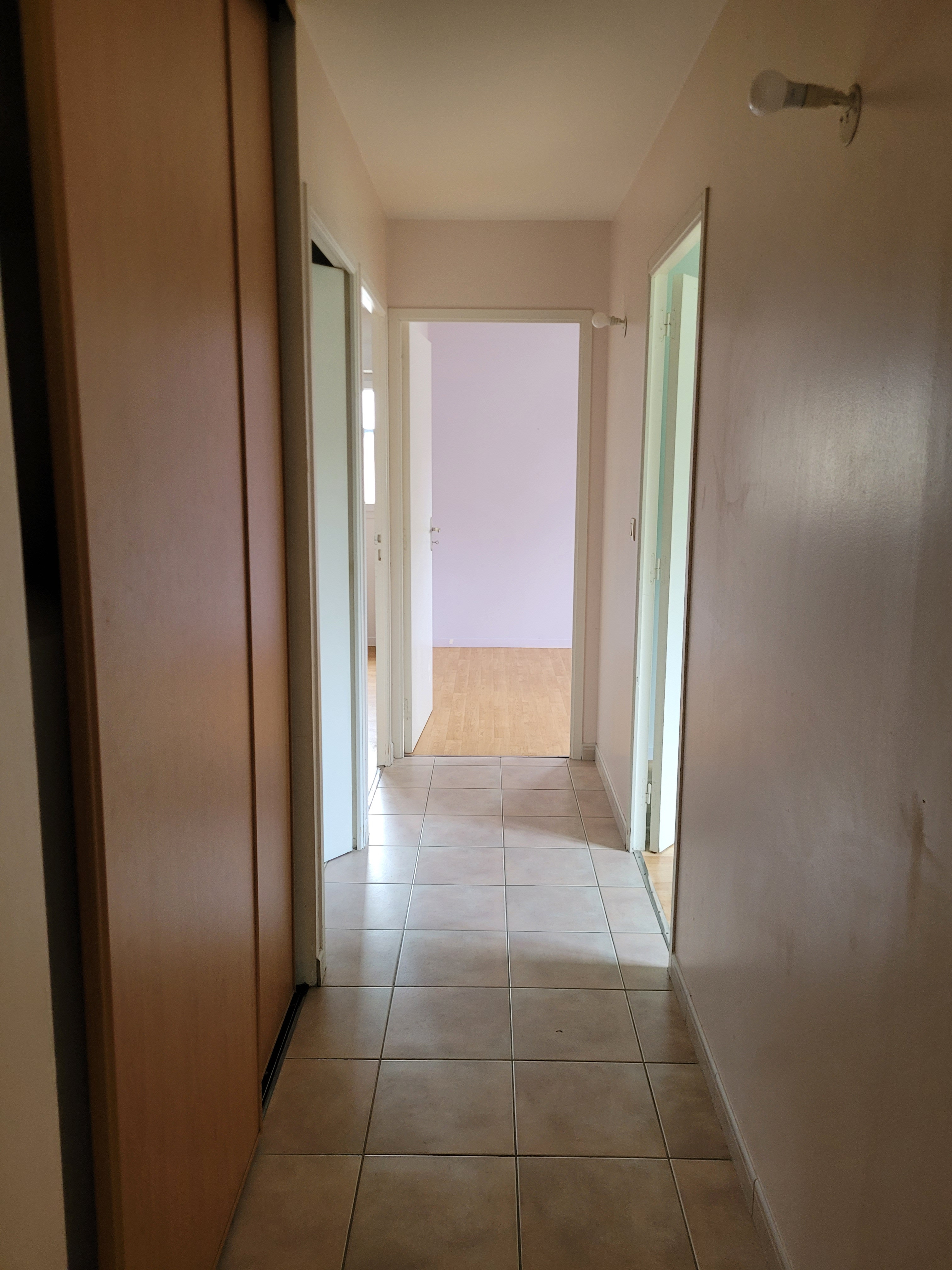 Appartement T4 entre la gare et le centre-ville, en rez de jardin, comprenant une entrée avec placard, un séjour avec coins cuisine aménagée, un couloir avec placard desservant trois chambres, une salle de bains, et un WC.