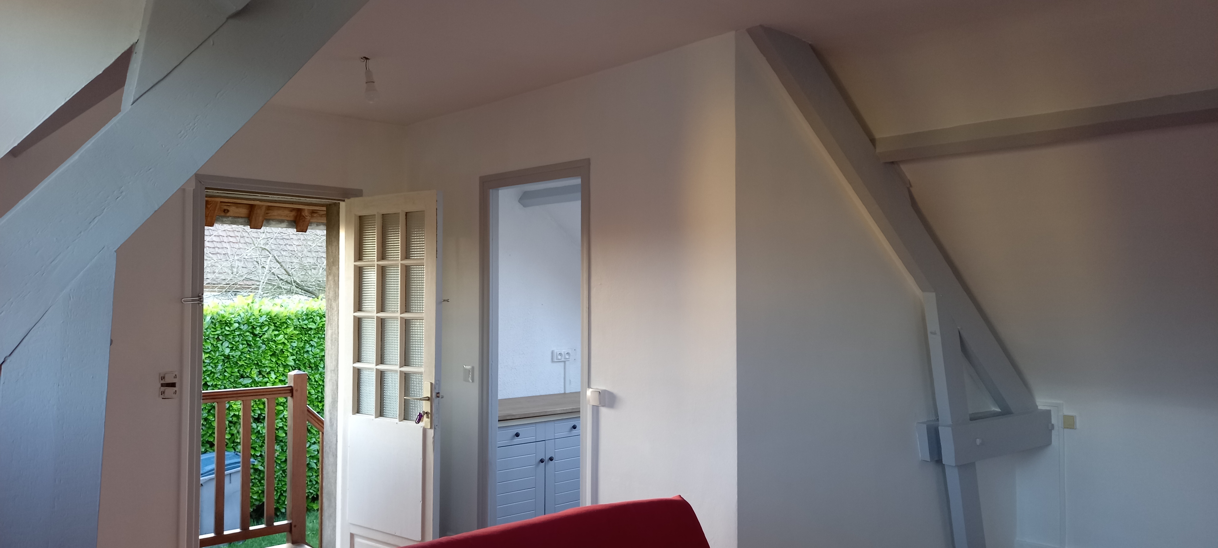 Dans le centre d'YVETOT - Studio rénové, lumineux et très agréable, au 1er étage avec accès individuel, qui offre une pièce à vivre, une cuisine aménagée et équipée (avec frigo, lave-vaisselle, plaques et four), une salle de bains avec baignoire, meuble vasque ainsi qu'un WC séparé. Chauffage gaz de ville. Compteurs EDF et eau individuels.
