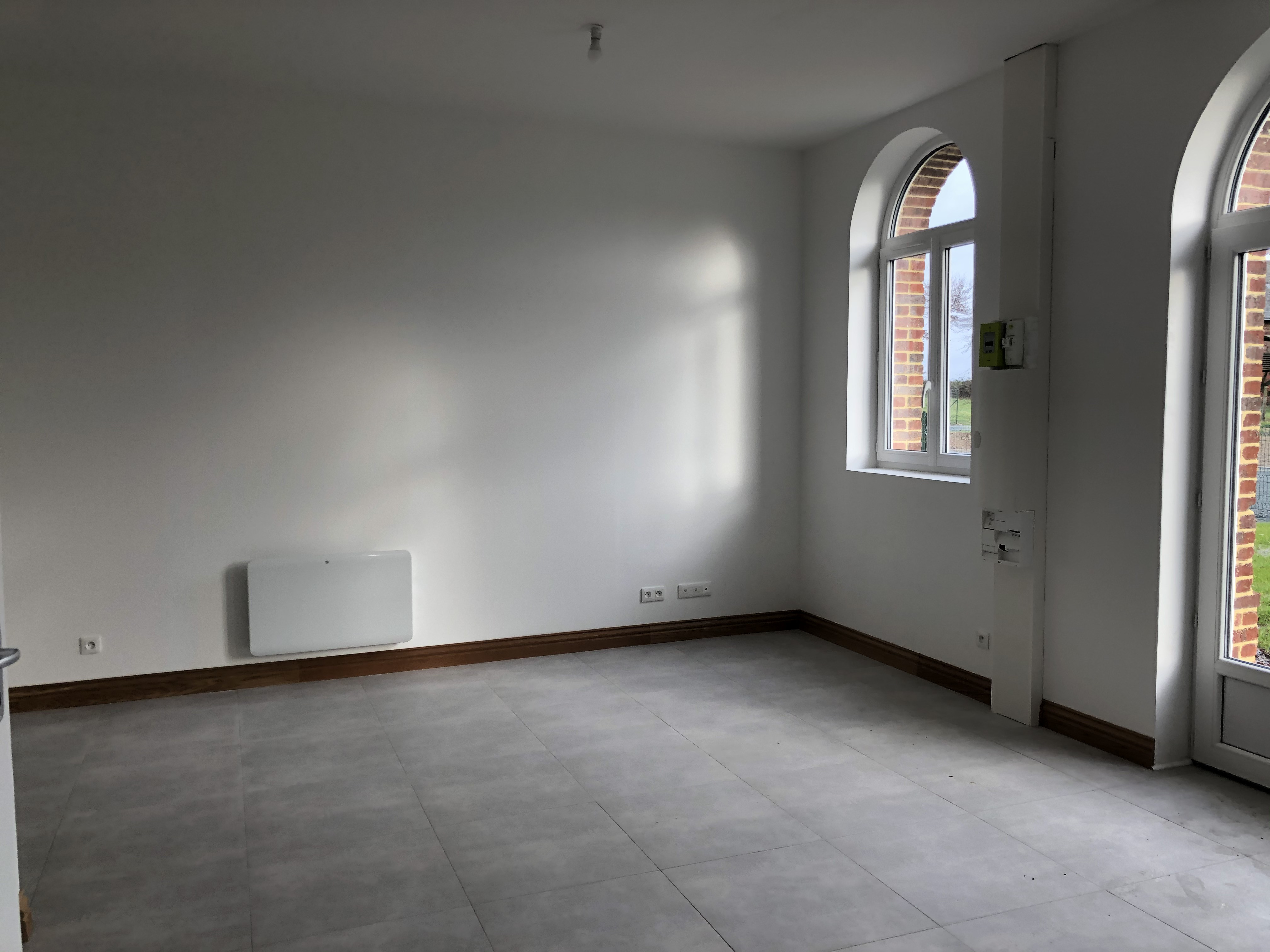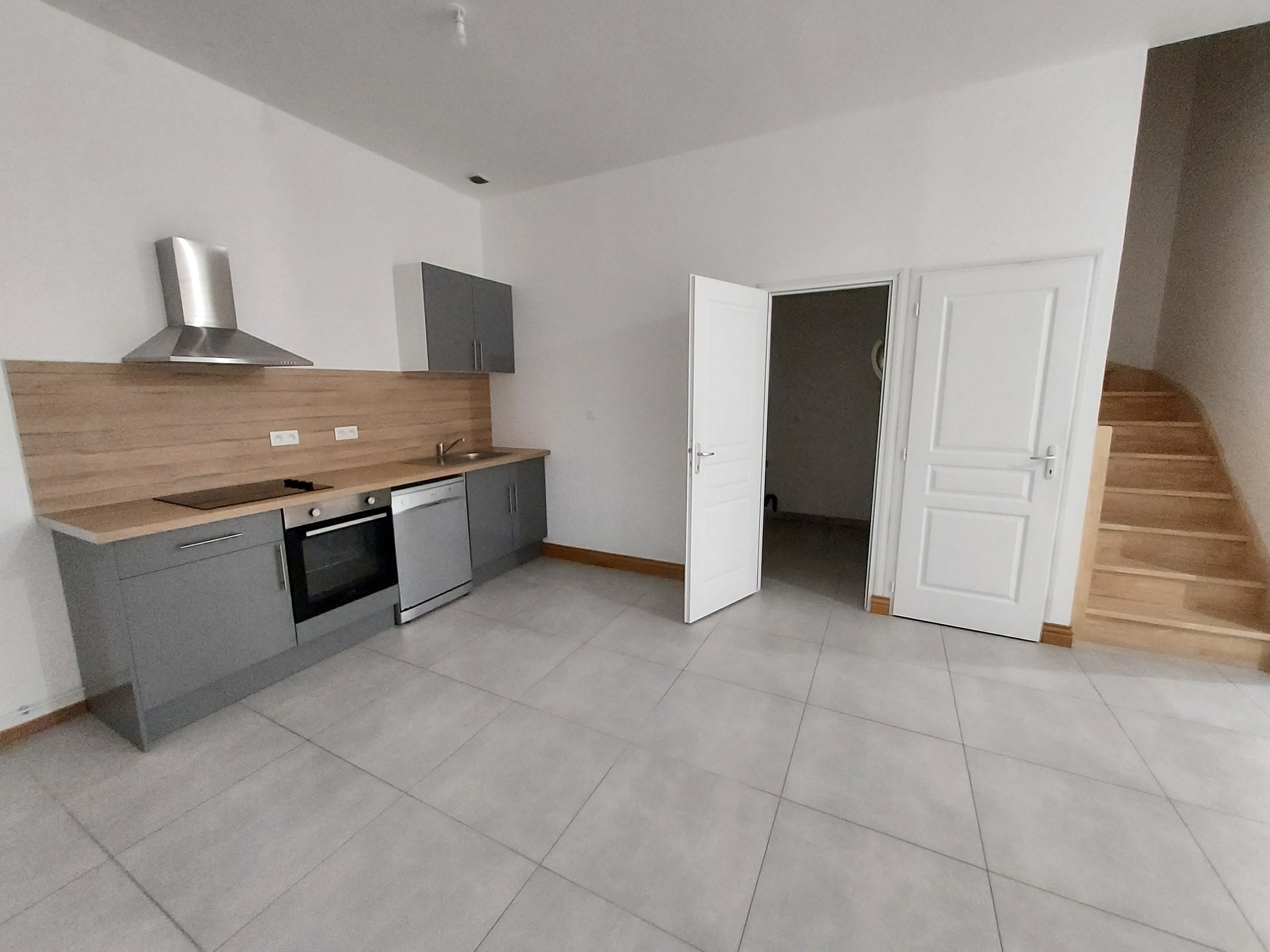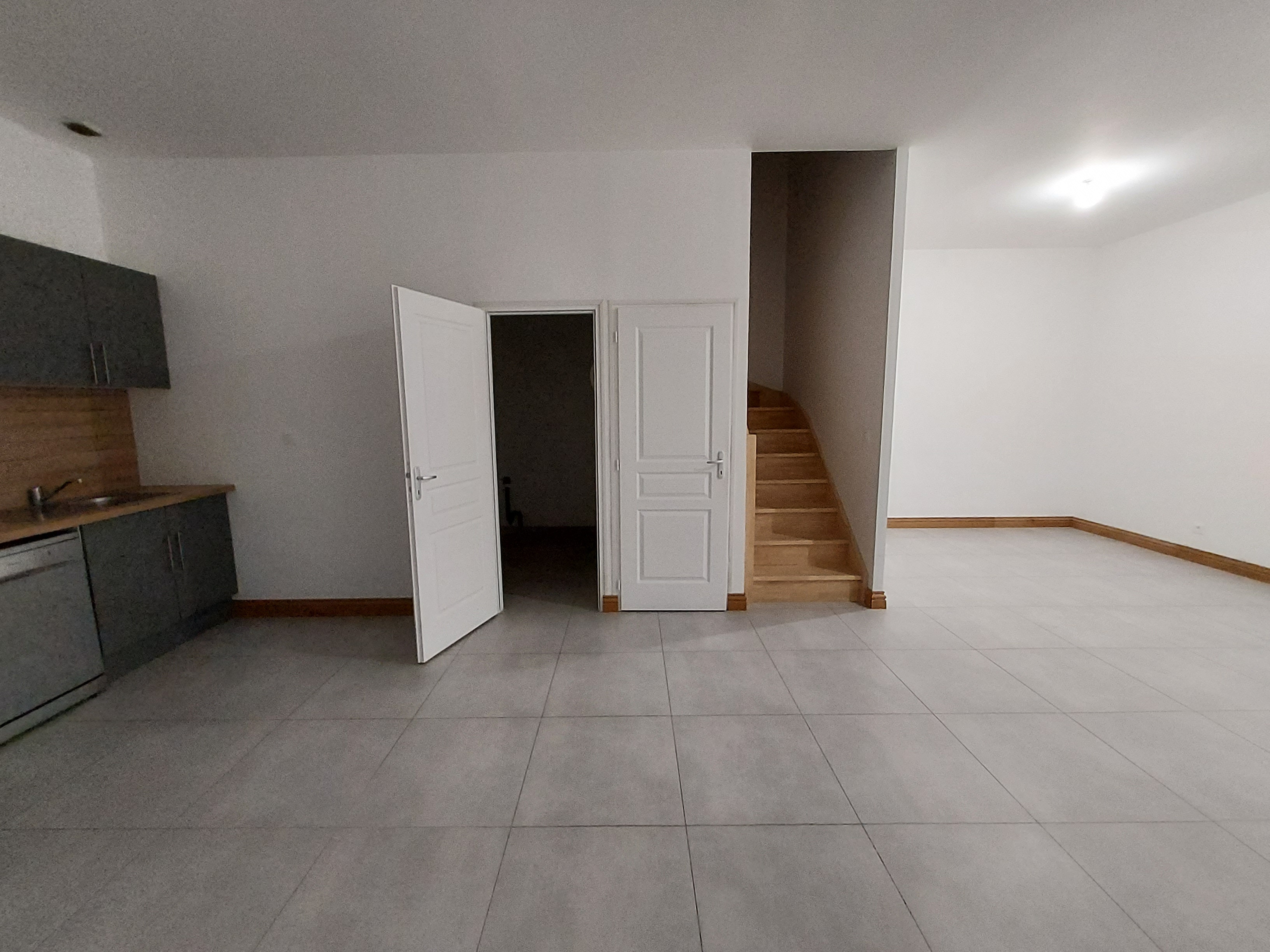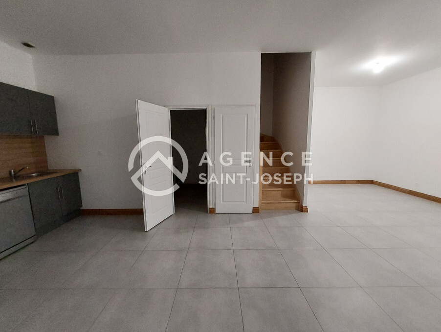 YVETOT - Appartement T3 entièrement rénové vous proposant : entrée dans le séjour avec cuisine ouverte aménagée et équipée (four, plaques à induction et hotte), wc et salle de douches. A l'étage : palier, WC avec lave-mains, deux chambres.