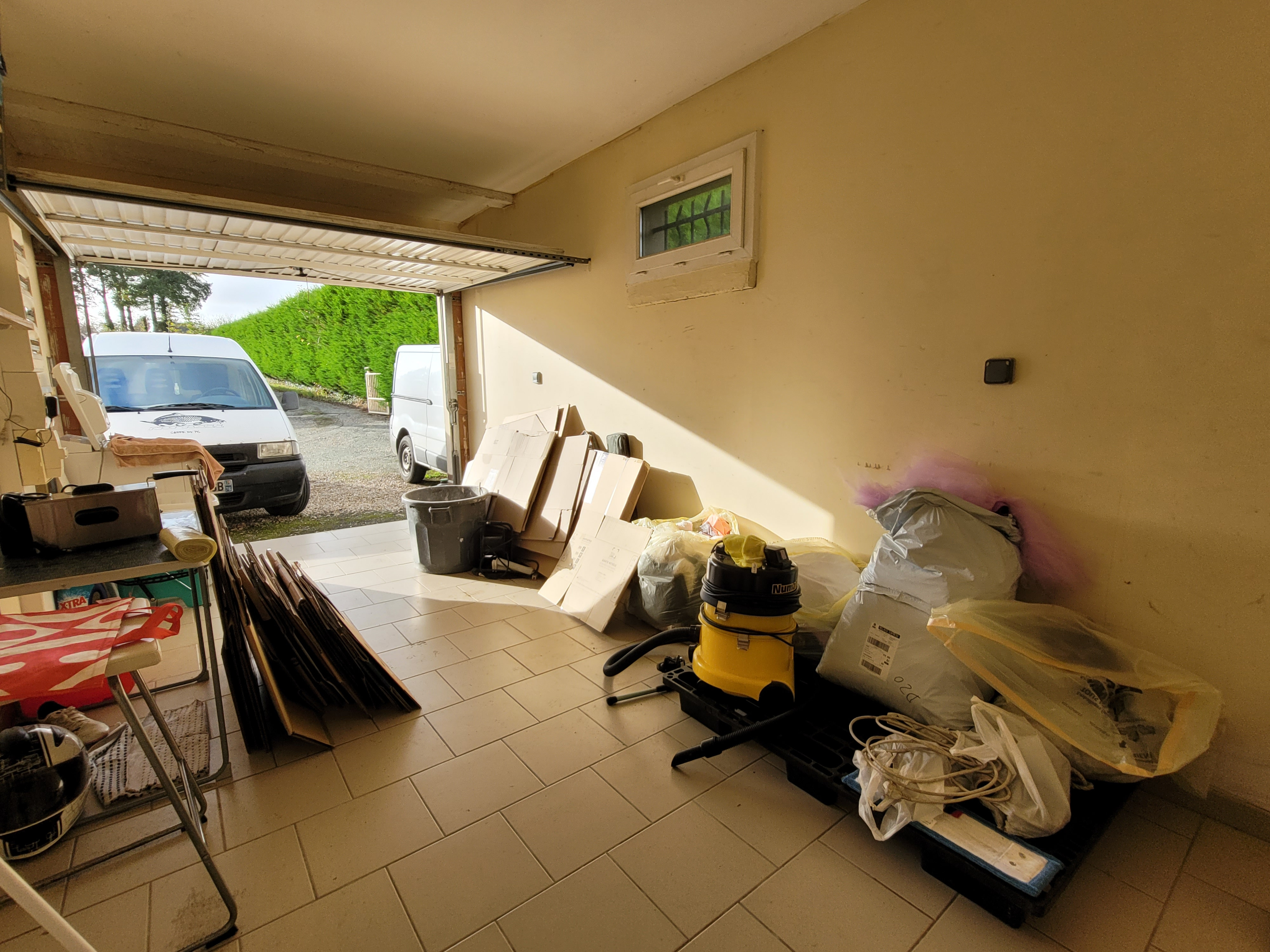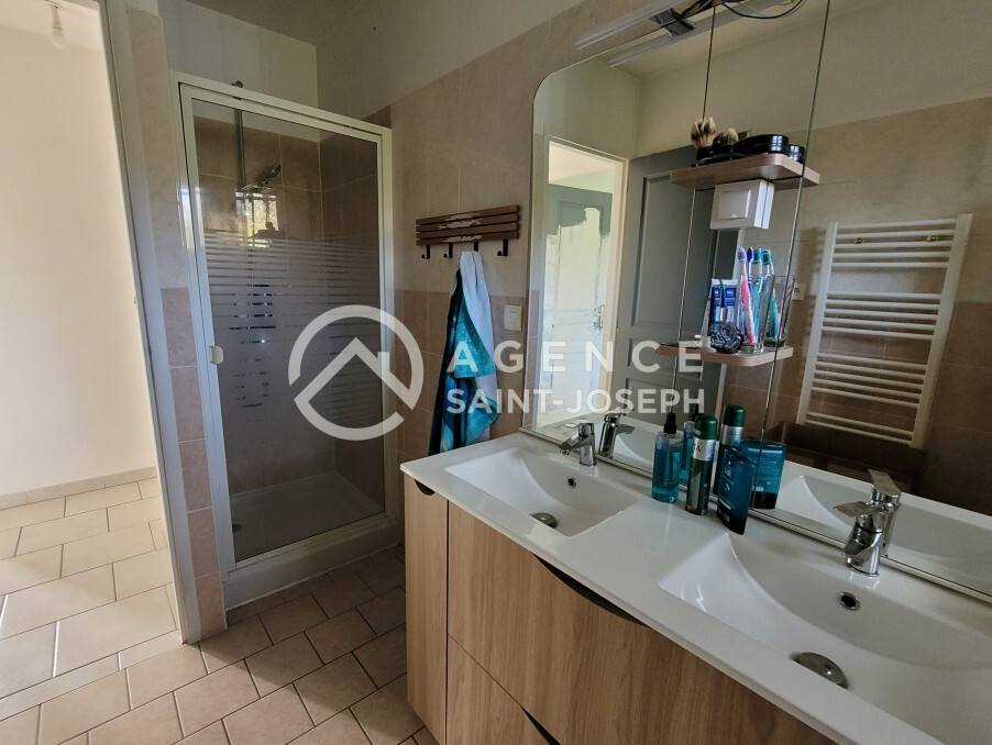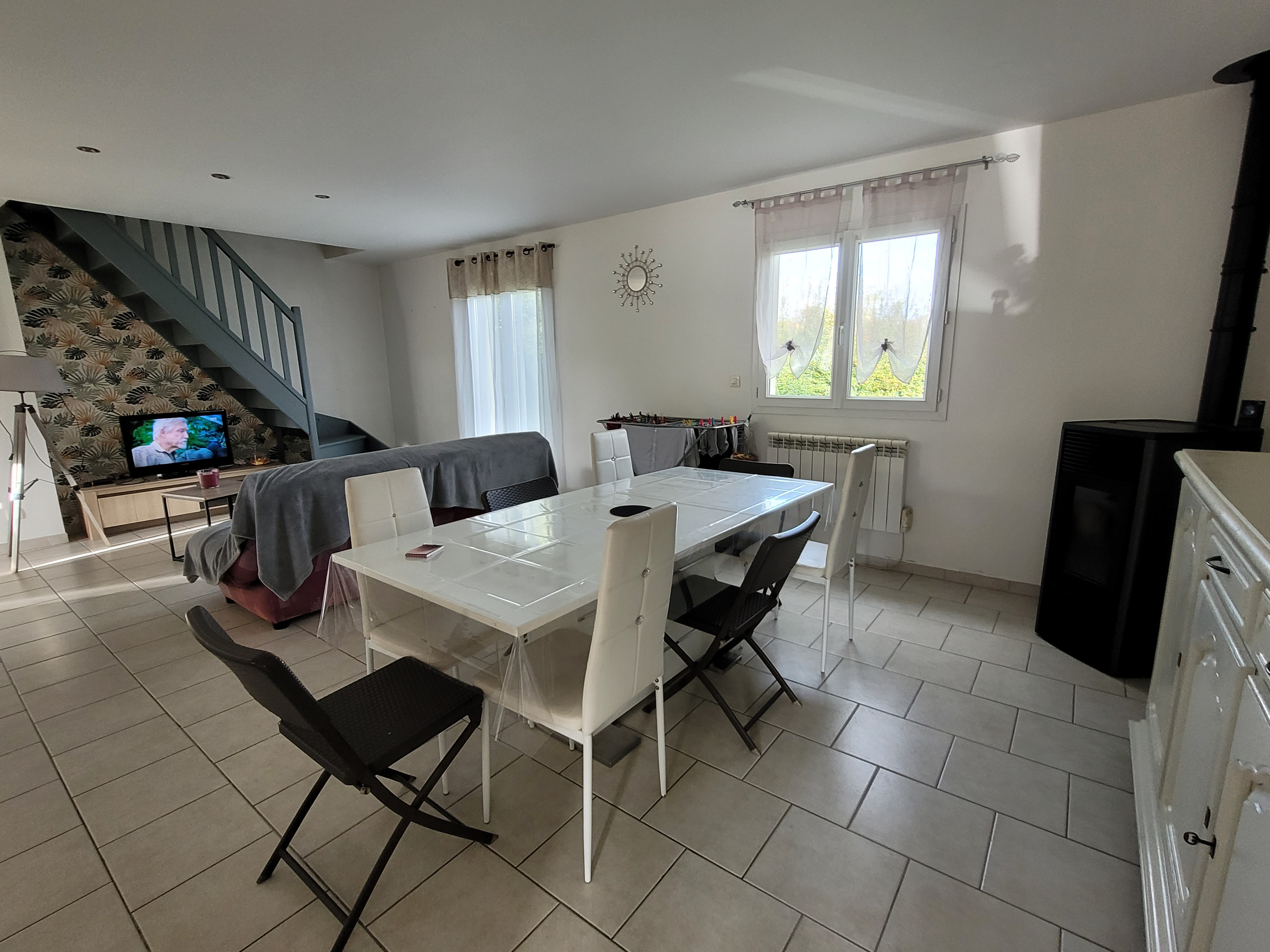- au rez-de-chaussée : une entrée avec rangement, une pièce de vie (46,32 m²) composée d'un séjour avec poêle à granulés et d'un coin cuisine aménagée et équipée (four, plaque gaz, hotte), un wc, une salle de bains (avec douche, baignoire et double vasque), une buanderie et un grand cellier, et trois chambres (de 9,74 m², 9,57 m² et 9,46 m²) ;