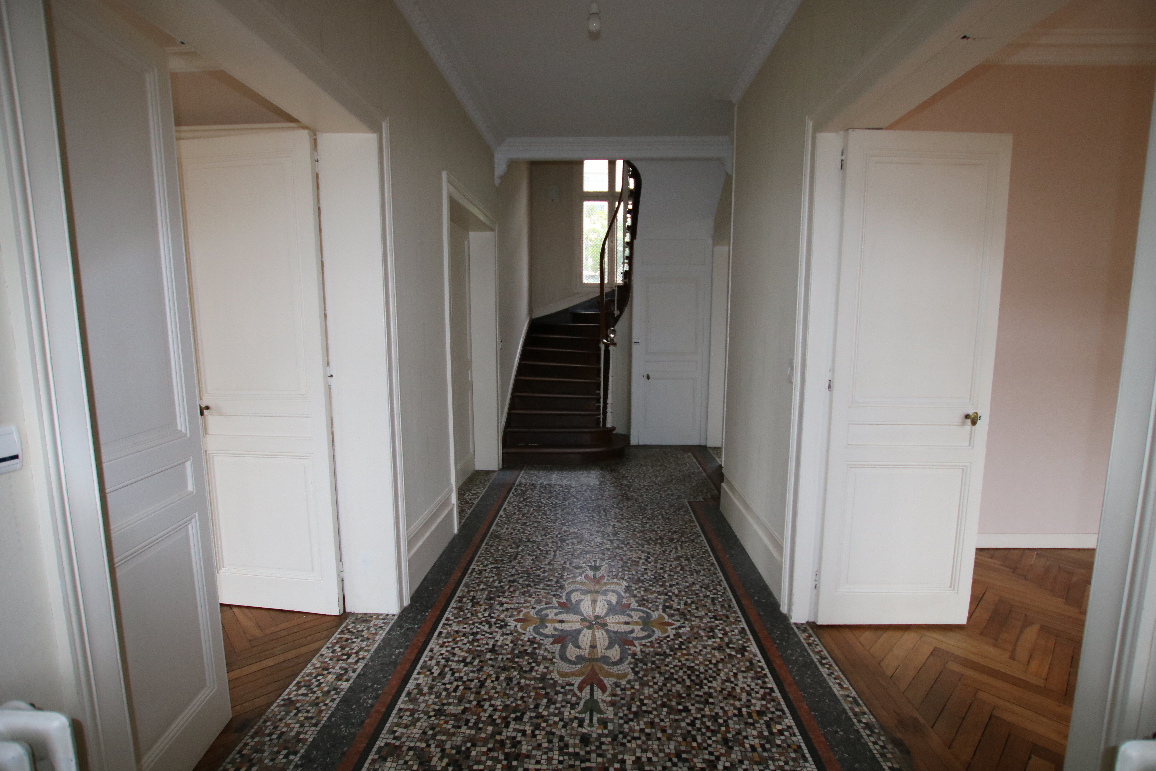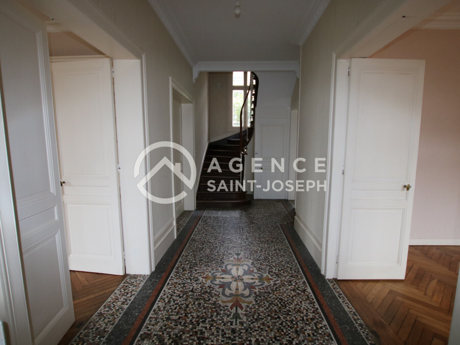 Charmante Maison Bourgeoise aux beaux volumes avec joli jardin clos d'environ 790 m². Elle offre : entrée, salle à manger de 31 m², séjour de 43 m² avec boiseries et cheminée, grande cuisine équipée, wc. A l'étage palier, dégagement, une salle de bains, wc, 3 grandes chambres, dressing, une salle de jeux, wc. Au second étage palier, dégagement, 3 grandes chambres, wc, deux pièces, mezzanine, une salle de douche. Jolis éléments d'époque, charme et authenticité. Terrasse. 4 Caves. Garage et place de parking extérieur. Fenêtres PVC double vitrage. Chauffage individuel au gaz de ville.