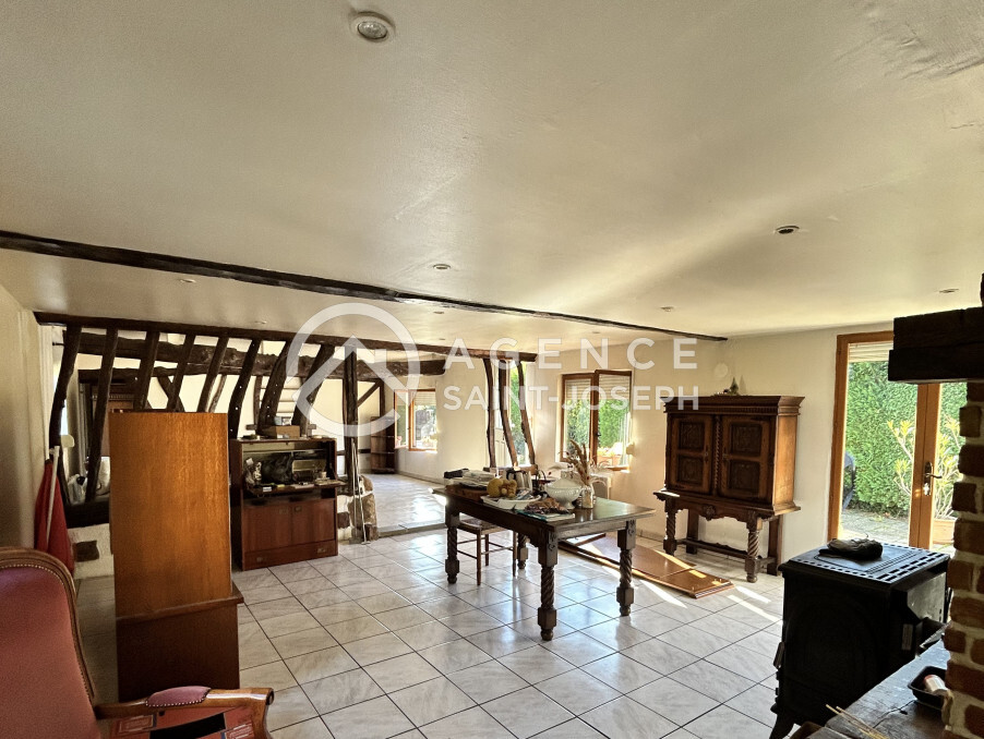 Maison Normande de PLAIN-PIED, édifiée sur un terrain clos de 2 219 m², offrant une cuisine aménagée ouverte sur la pièce de vie (50 m²), une salle à manger avec cheminée (30 m²), un cellier, une salle de bains (baignoire et douche), 3 chambres, buanderie. Chauffage électrique. Fosse septique. A venir découvrir ! Réf 7153
