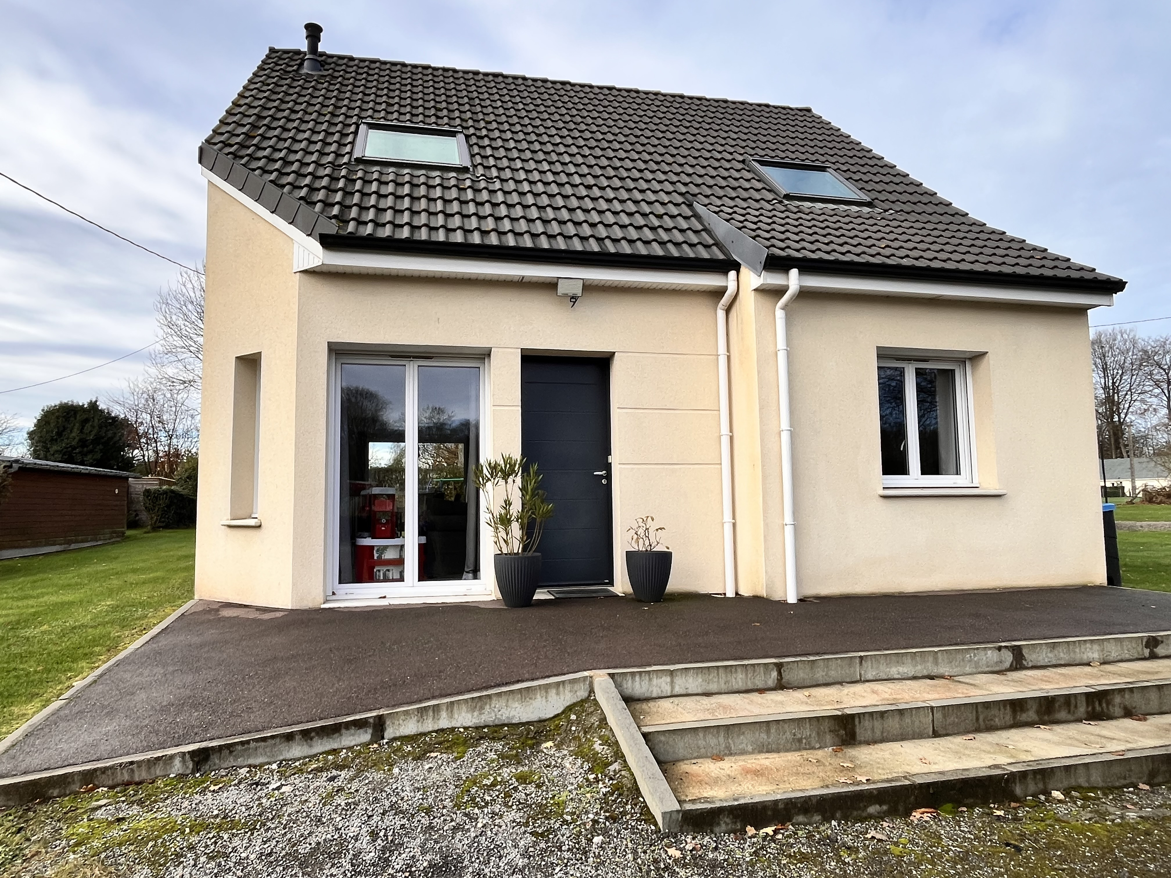 Maison individuelle de 2017 (encore sous garantie décennale), édifiée sur un beau jardin exposé plein sud d'une surface d'env. 1700 m². Elle vous offre une entrée sur une belle pièce de vie avec poêle à granulés ouverte sur la cuisine aménagée et équipée (env. 38 m²), une chambre (13.32 m²), un cellier, un wc. A l'étage palier, dressing, deux chambres, une salle de bains (baignoire, douche et wc sani-broyeur). Cumulus thermodynamique. Fosse septique conforme. Elle n'attend plus que vous ! Réf 7194