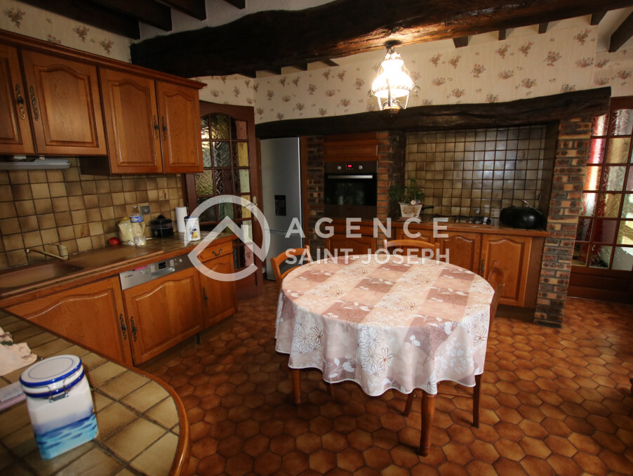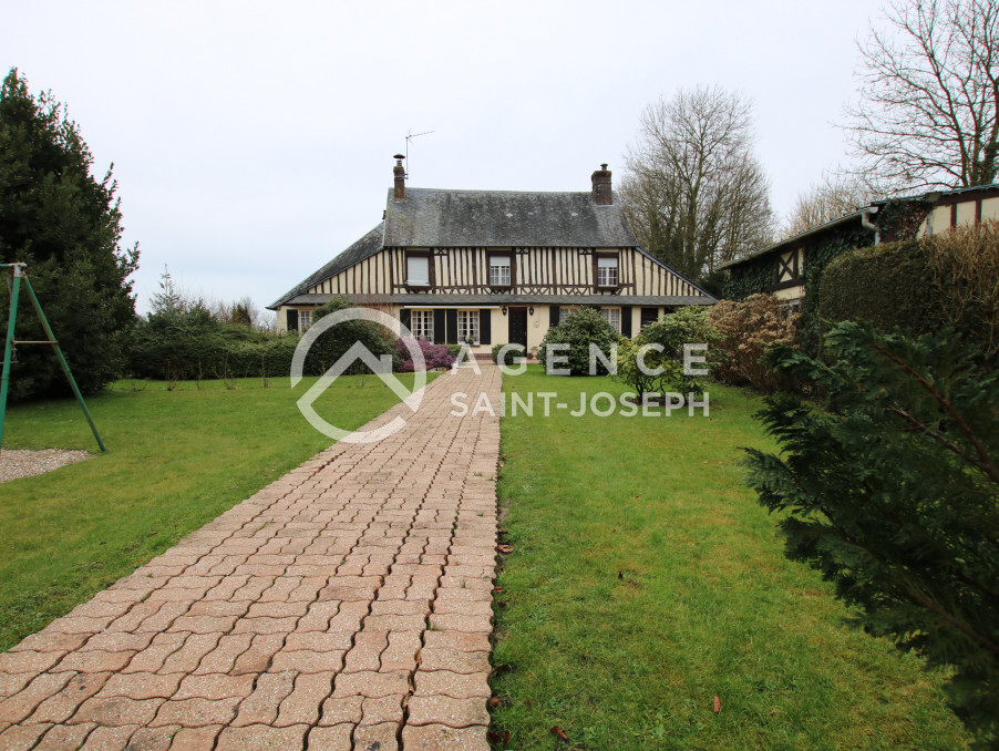 Maison Normande édifiée sur 976 m² de terrain clos, comprenant entrée, cuisine aménagée et équipée, salon avec cheminée (15 m²), salle à manger (18 m²), lingerie, arrière cuisine, chaufferie, salle de bains, wc. A l'étage 3 chambres et bureau, wc. Chauffage fuel. Deux garages dont un grand pour camping car. Possibilté d'agrandir le salon d'env. 20 m². Réf 6984