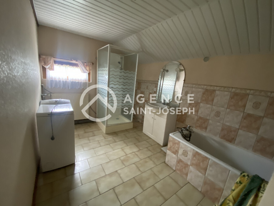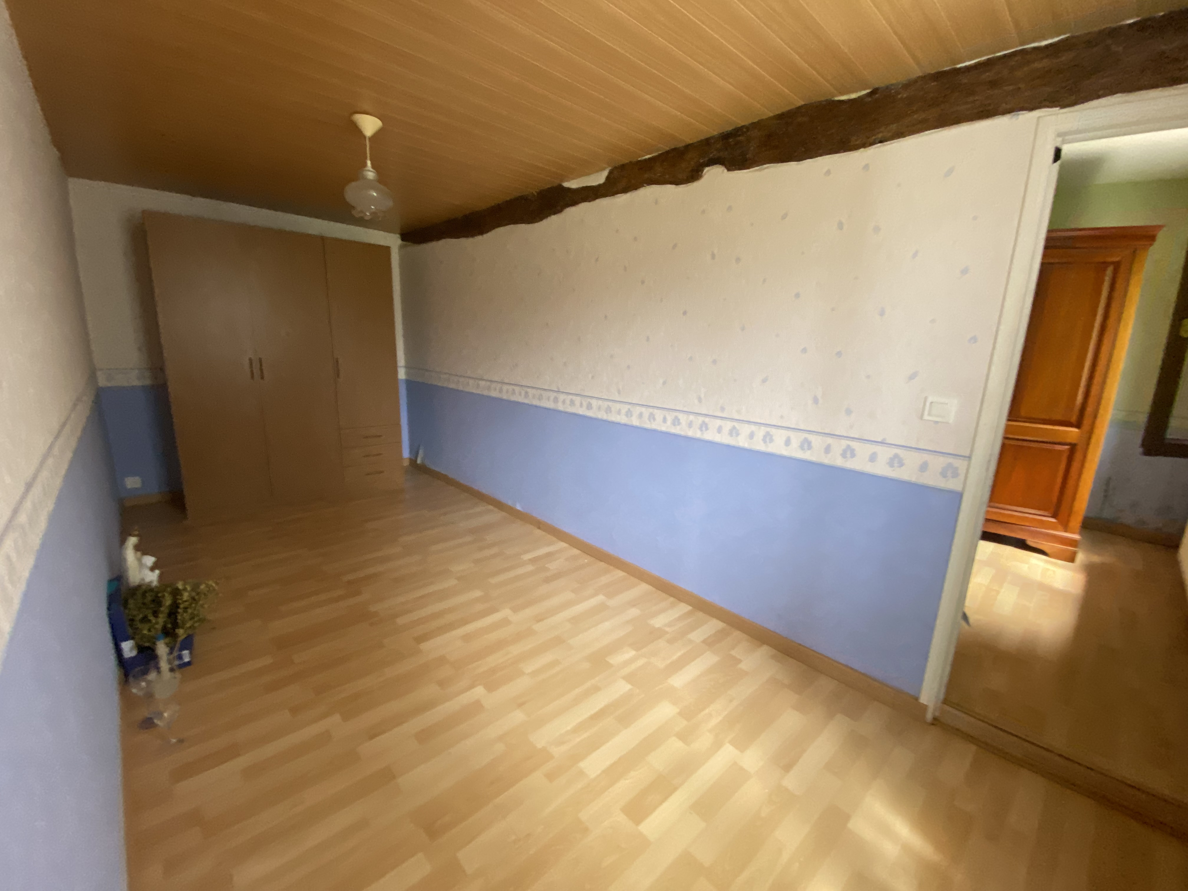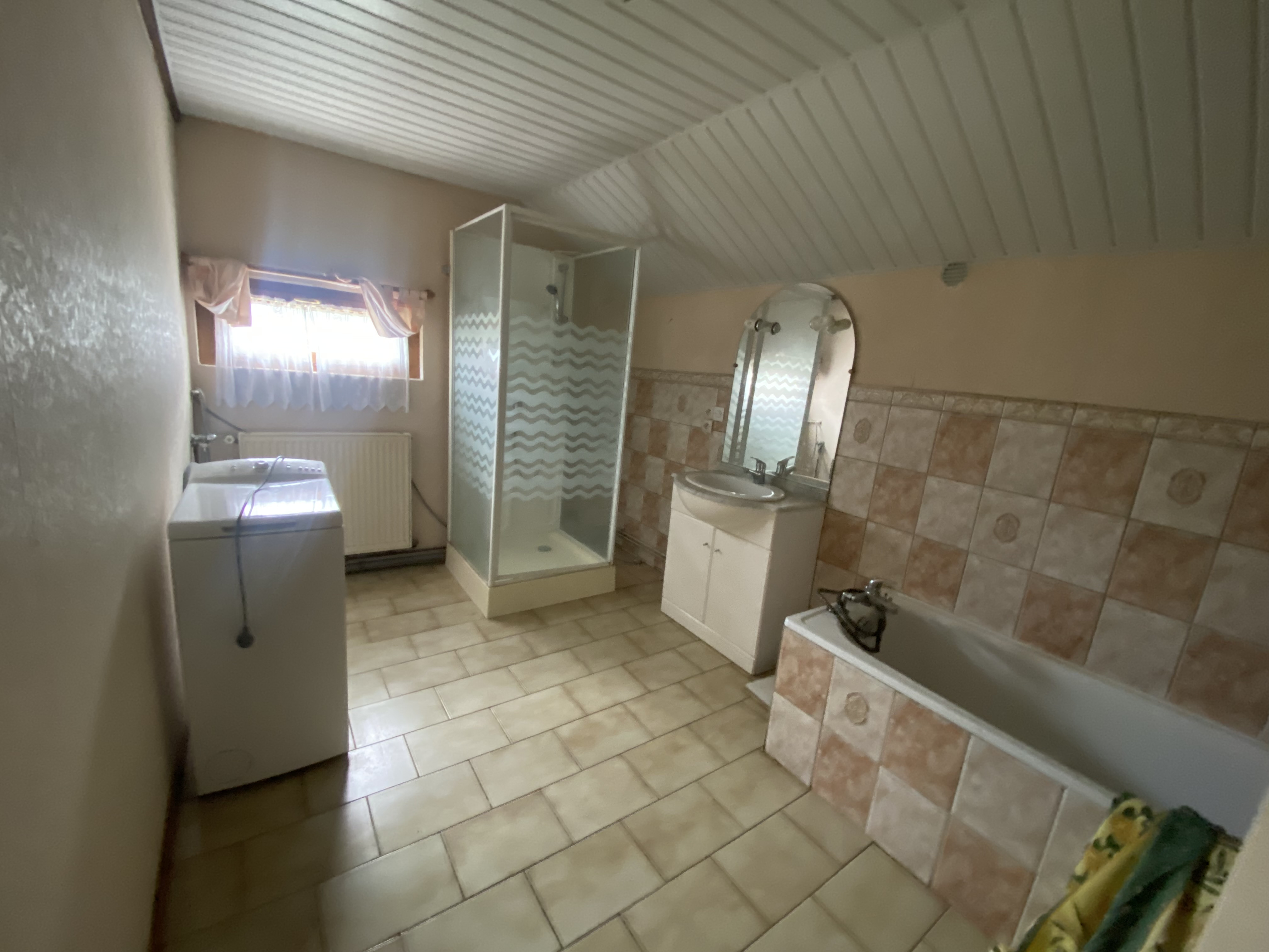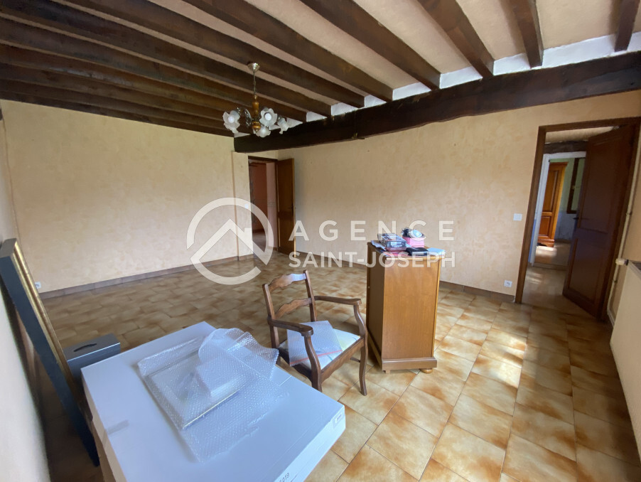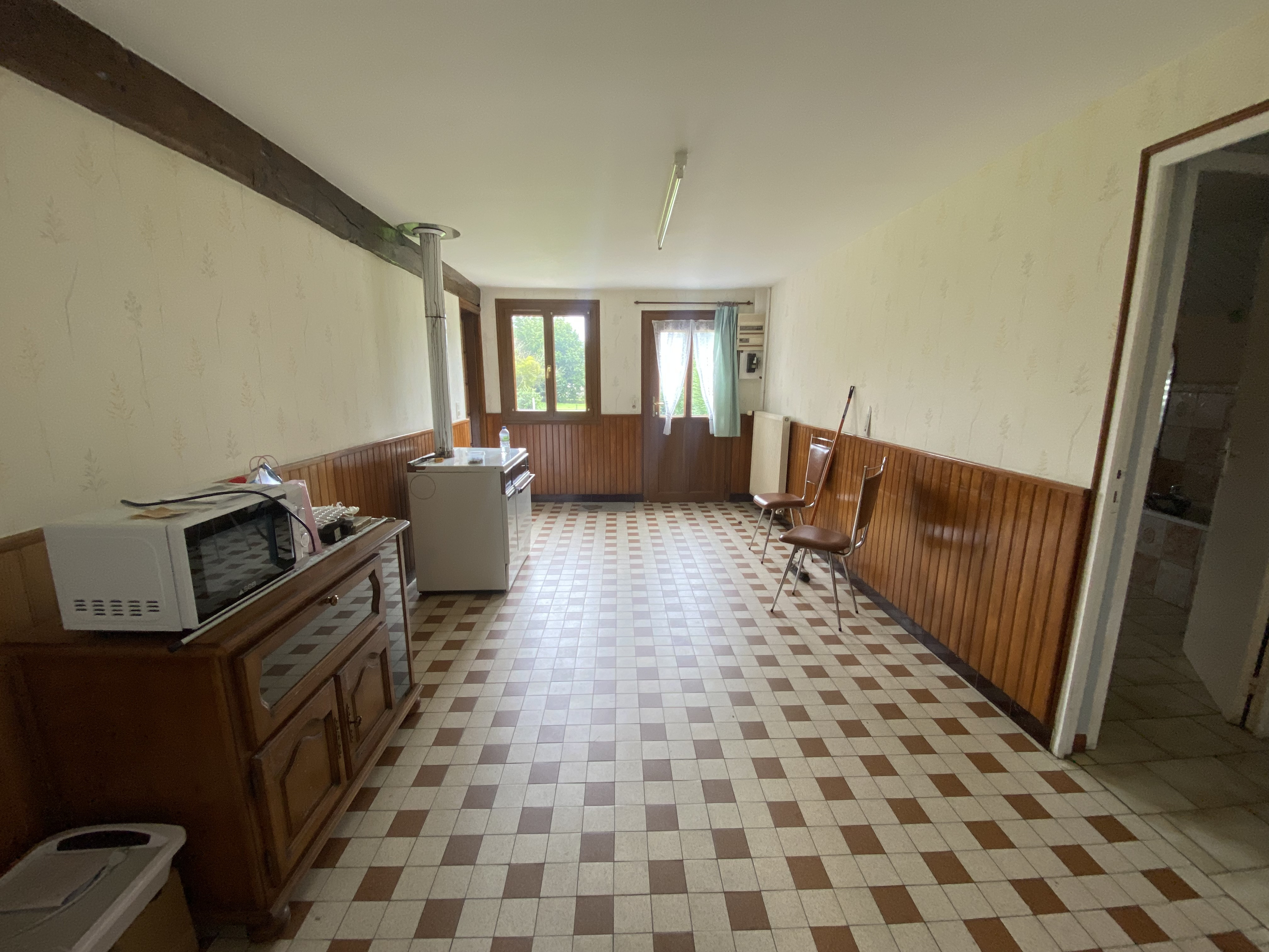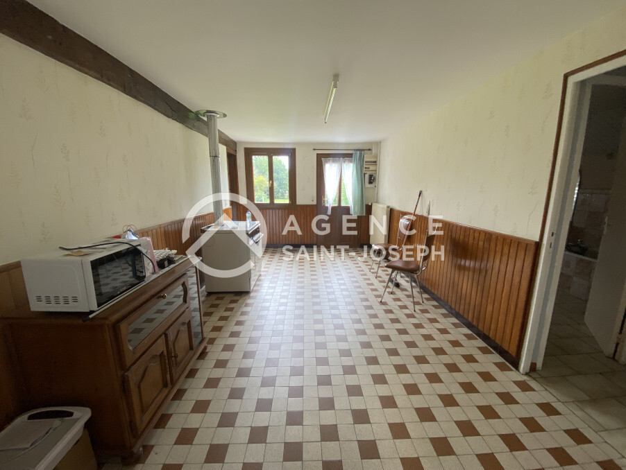 Maison normande de plain-pied, édifiée sur un terrain de 720 m², comprenant une grande cuisine (17 m²), une arrière cuisine, une salle à manger (21 m²), un cellier, une salle de bains (baignoire et douche), wc séparé, 4 chambres (9 m², 11.40 m², 13.40 m² et 10 m²). Grand atelier de 35 m². Chauffage au gaz de ville. Chaudière Saunier Duval. A rafraîchir. Réf 7098